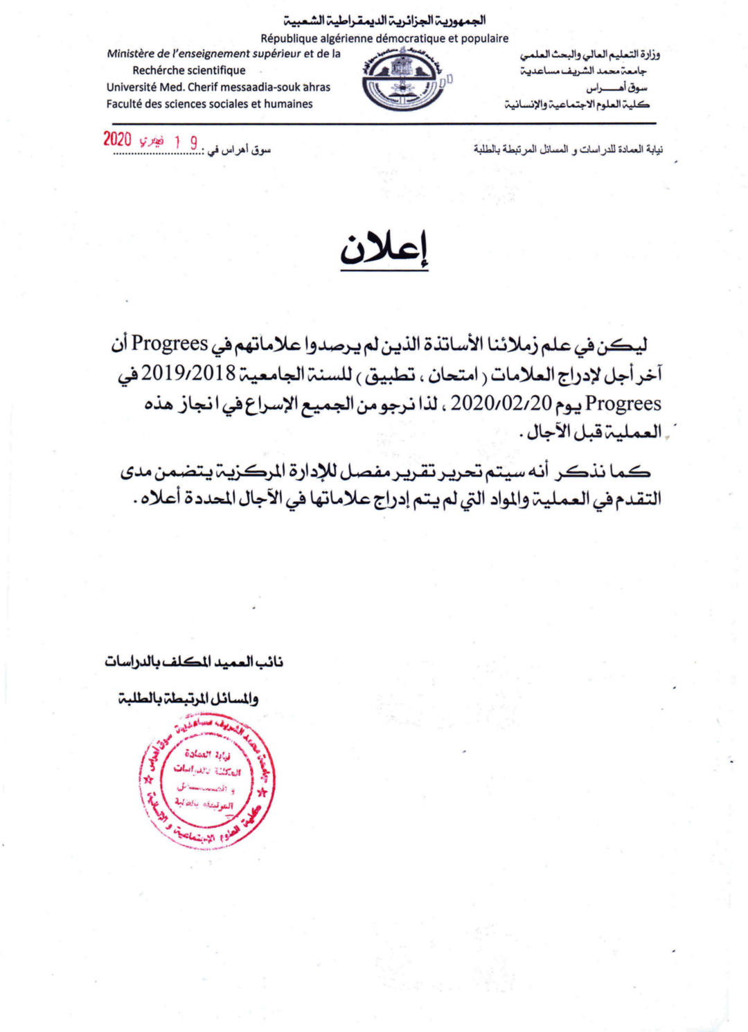 PROGREES إعلان لجميع أساتذة الكلية بخصوص