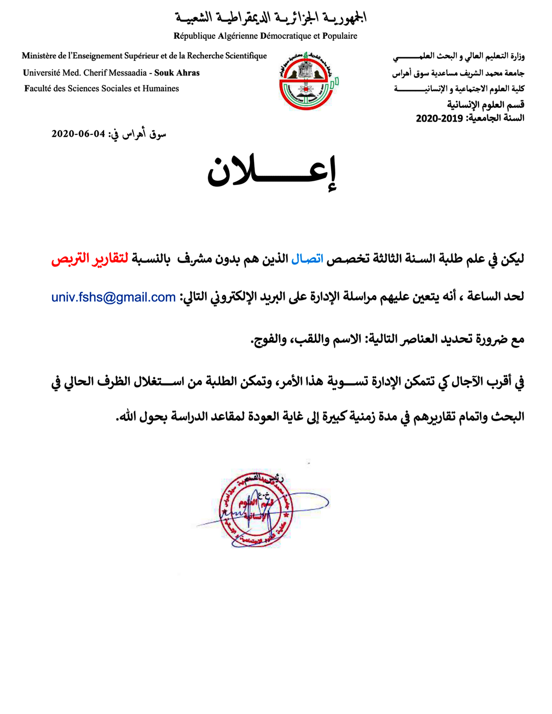 إعـــــــلان لطلبة تقارير التربص دون مشرف