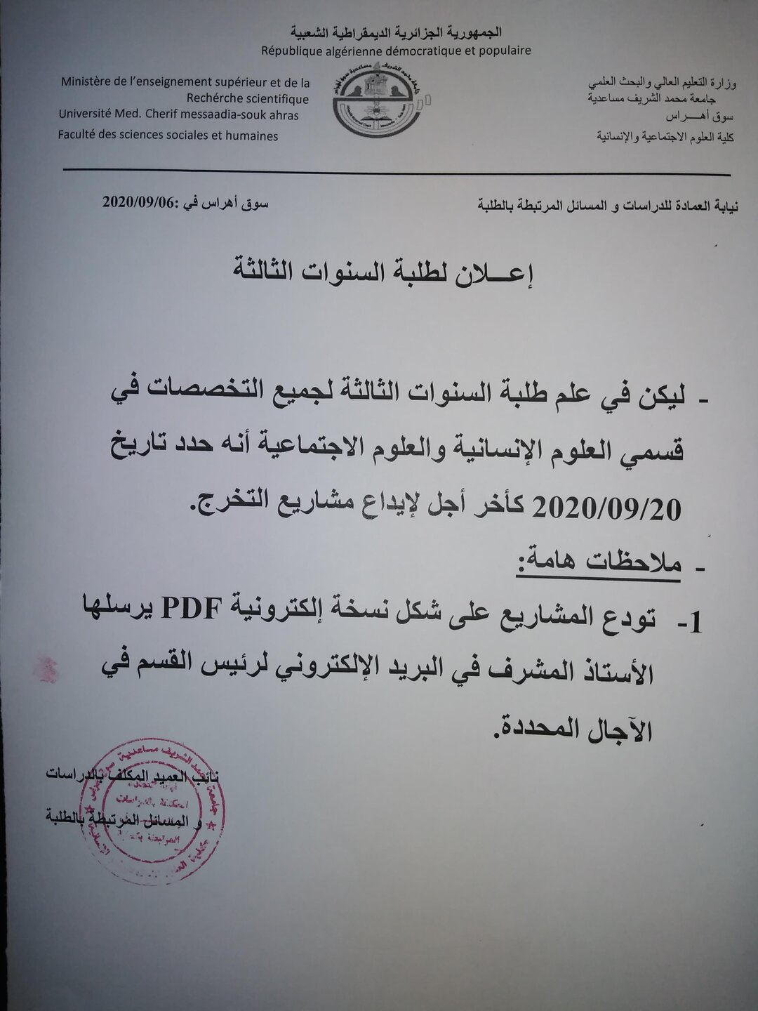 إعلان لطلبة السنة الثالثة