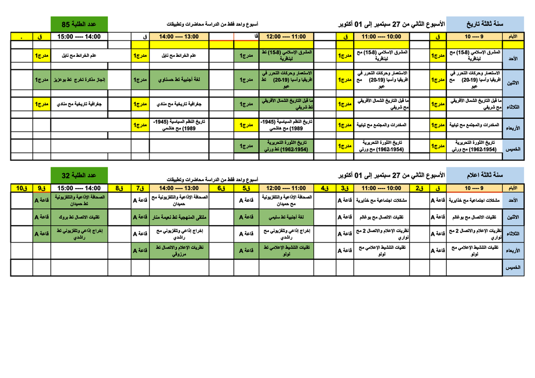 إعلان خاص بالسنة الثالثة تاريخ وإعلام lun. 21 sept. 2020 15:18 dim. 27 sept. 2020 13:58 ليكن في جميع طلبة قسم العلوم الانسانية سنة ثالثة تاريخ واعلام، أن الدراسة الحضورية ستكون بداية من يوم الأحد 27 سبتمبر إلى غاية 1 أكتوبر من نفس الشهر وفق الرزنامة المحددة في أسفله:
