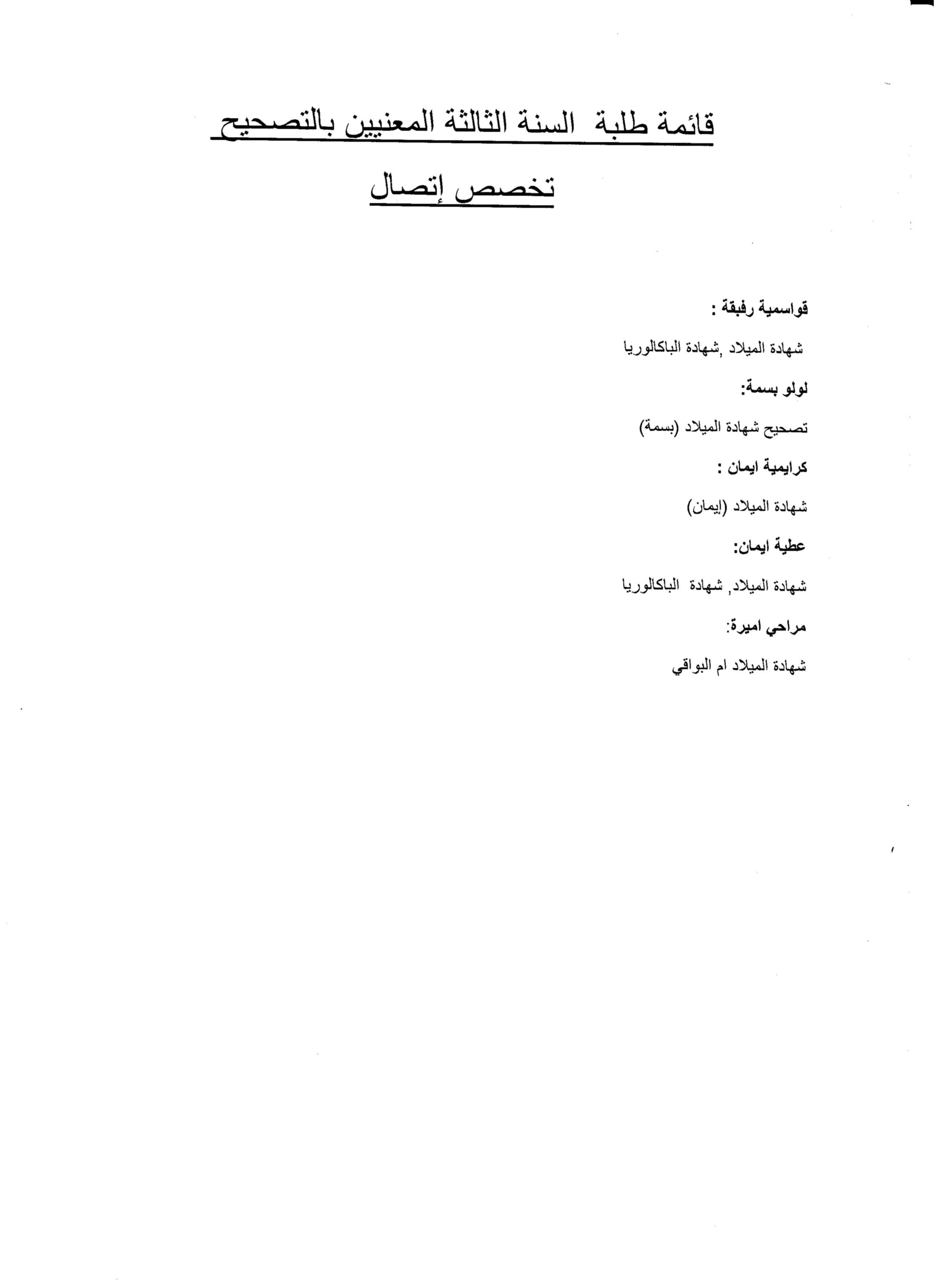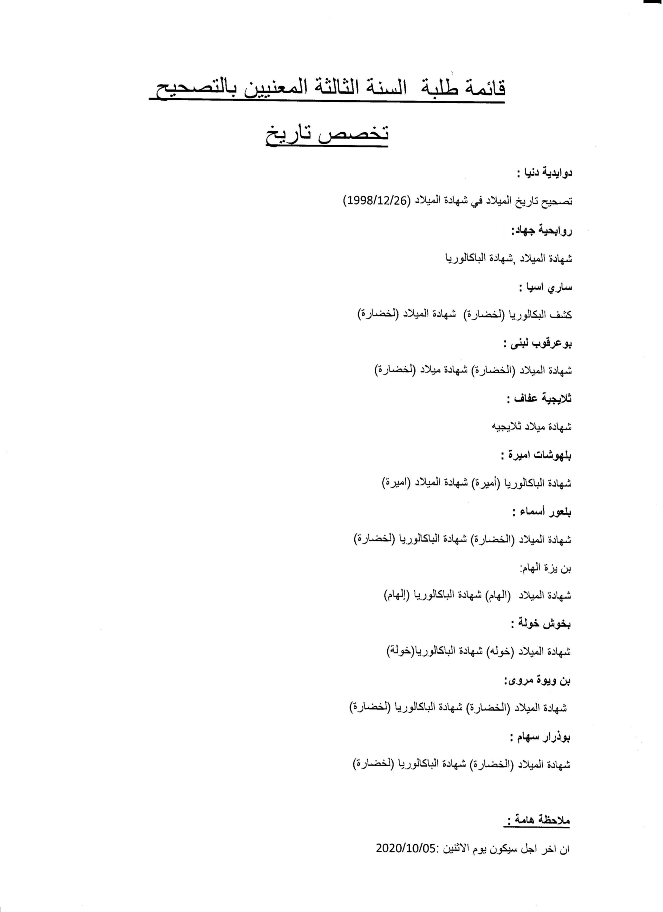 إعلان خاص بطلبة السنة الثالثة قسم العلوم الانسانية ven. 2 oct. 2020 15:47 dim. 4 oct. 2020 07:50 تطلب إدارة قسم العلوم الانسانية من الطلبة الواردة أسماؤهم في المرفقات، بضرورة احضار الوثائق المطلوبة في أقرب الآجال، وقد حدد آخر أجل يوم الاثنين 5 أكتوبر 2020