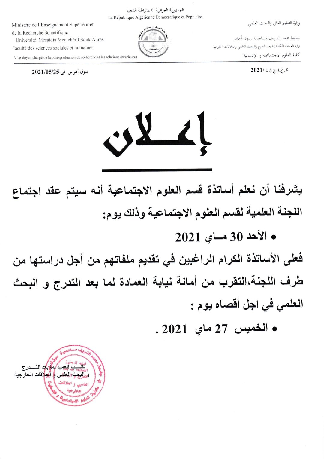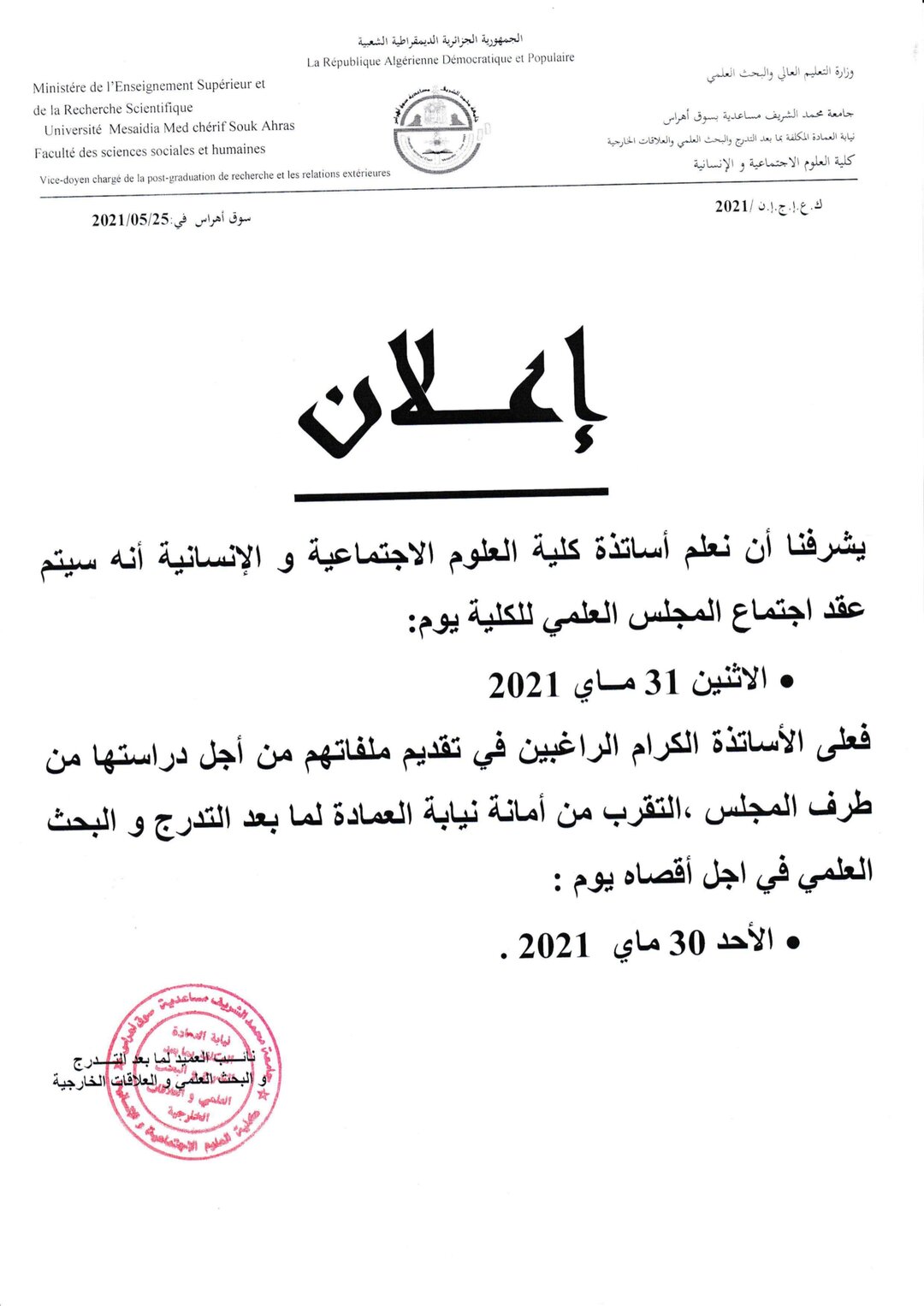 إعلان لجميع الأساتذة بخصوص اللجان العلمية والمجلس العلمي للكلية
