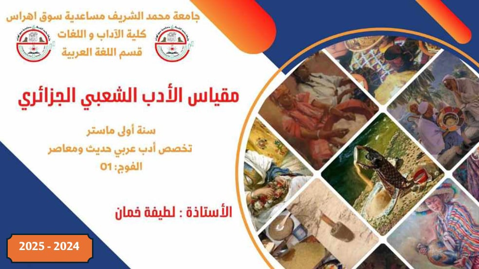 مقياس الأدب الشعبي من المقاييس المائزة التي يتعالق معها الطلبة، لاسيما طلبة السنة أولى ماستر المعنيين ومن فلكه بمقياس الأدب الشعبي الجزائري، الذي يحتفي بالتراث، وبالثقافة الشعبية الجزائرية، وبكل متعالقاتها، وبالنسبة لتشكيلته فقذ بني على 14محورا، وفق السيرورة البيداغوجية
