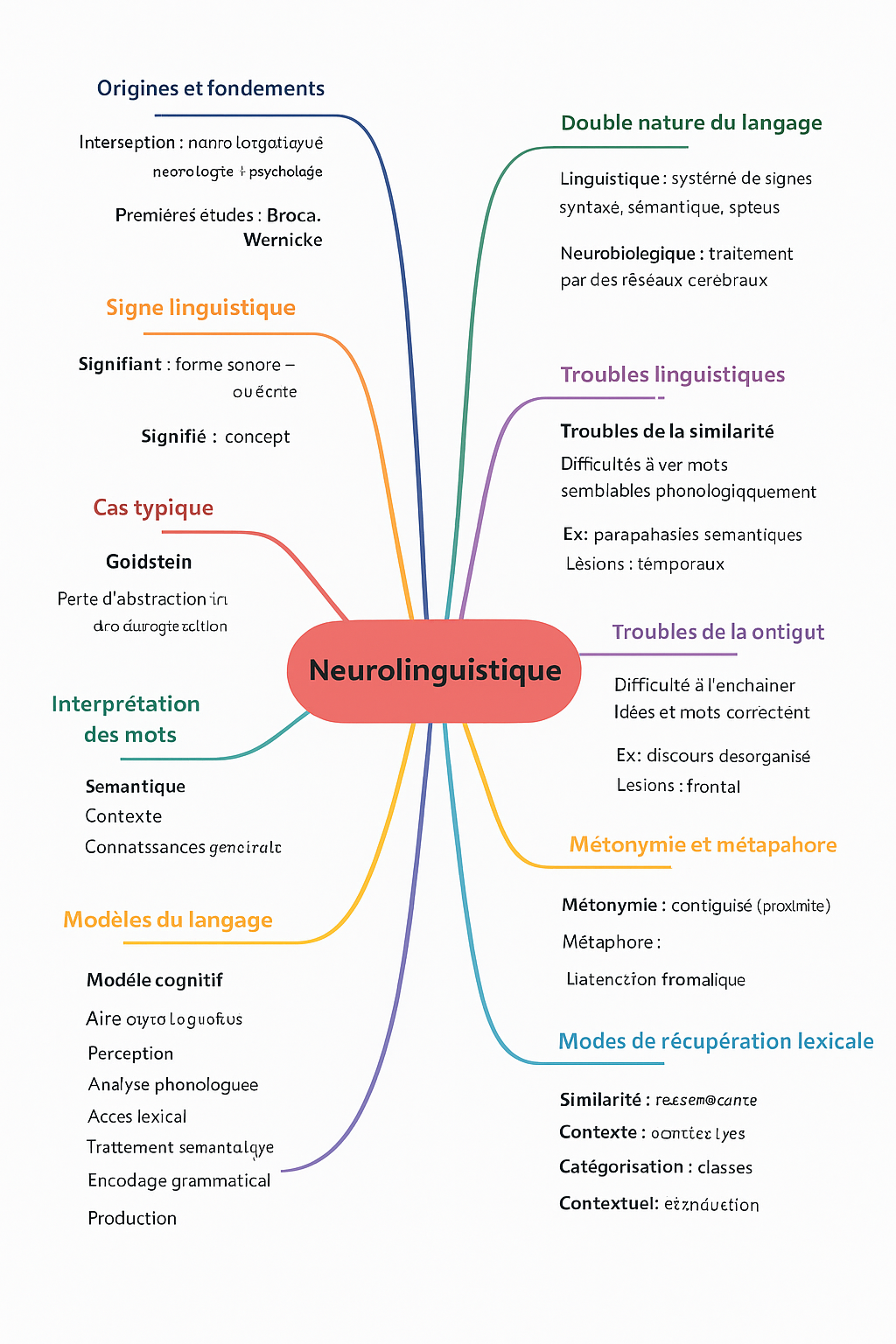La neurolinguistique est une branche de la neuropsychologie qui étudie les relations entre le langage et les structures cérébrales. Elle s'intéresse notamment aux mécanismes neuronaux qui contrôlent la compréhension, la production et l'acquisition du langage. Cette discipline est interdisciplinaire, combinant les neurosciences, la linguistique, la neuropsychologie et les sciences cognitives. Elle a émergé à partir de l'étude des aphasies, qui associent des troubles spécifiques du langage à des lésions cérébrales précises.