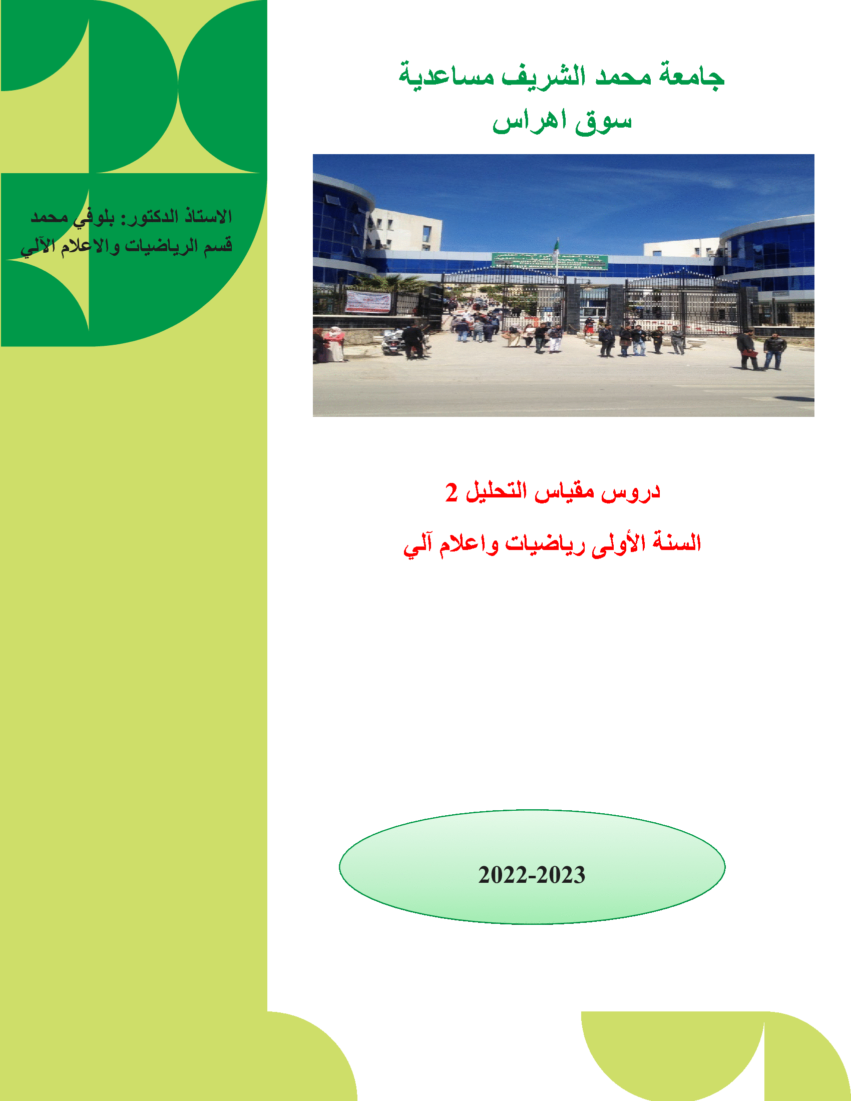 هذه المطبوعة موجهة لطلاب السنة الأولى جذع مشترك رياضيات وإعلام آلي، وقد كتبت هذه المطبوعة بعد 3 سنوات تدريس لهذه المادة بجامعة سوق اهراس وذلك وفق منهاج الوزارة المعتمد في مقياس التحليل 2.