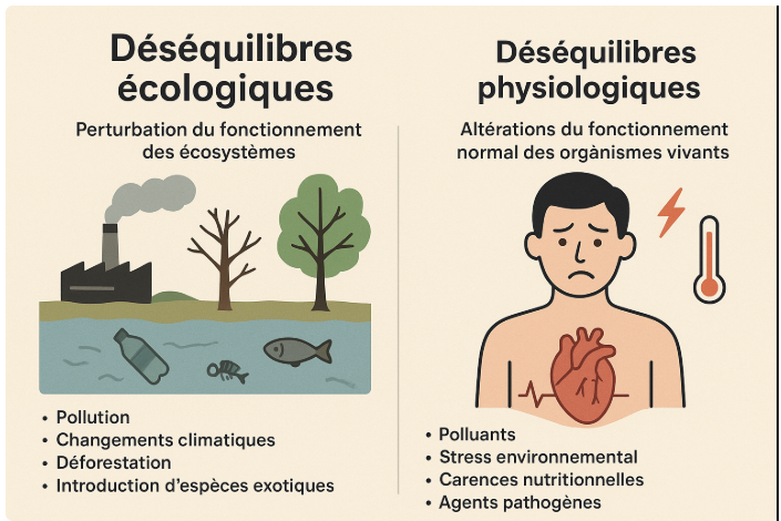Les déséquilibres écologiques et physiologiques désignent les perturbations qui affectent le fonctionnement normal des écosystèmes et des organismes vivants.
