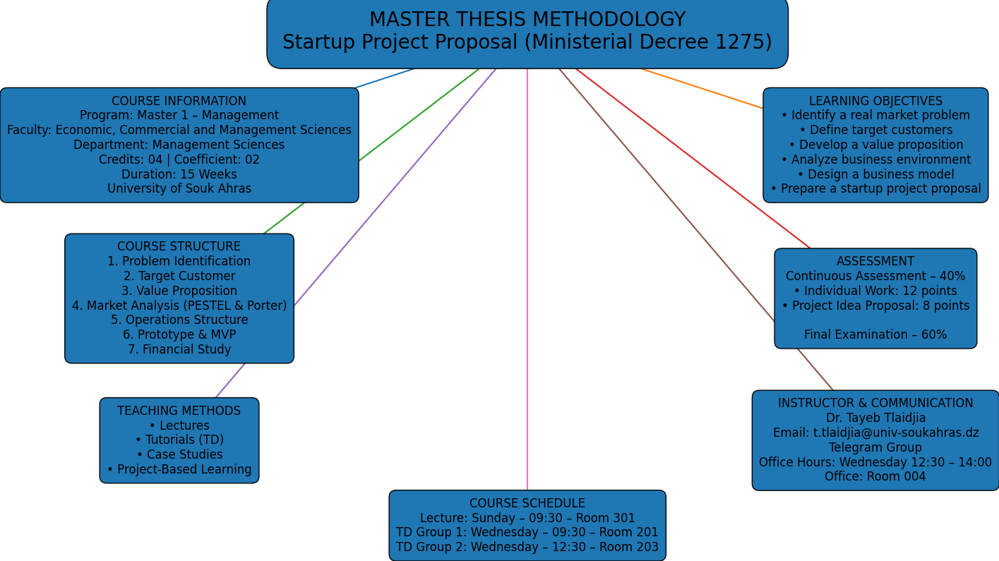 The main components of the course “Master Thesis Methodology” and the key stages for preparing a project proposal can be summarized in the following conceptual map.